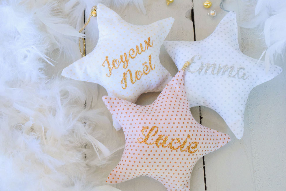 Toutes mes étoiles de Noël personnalisées sont réalisées à la main dans mon atelier, avec des tissus soigneusement sélectionnés : coton, lin, velours…